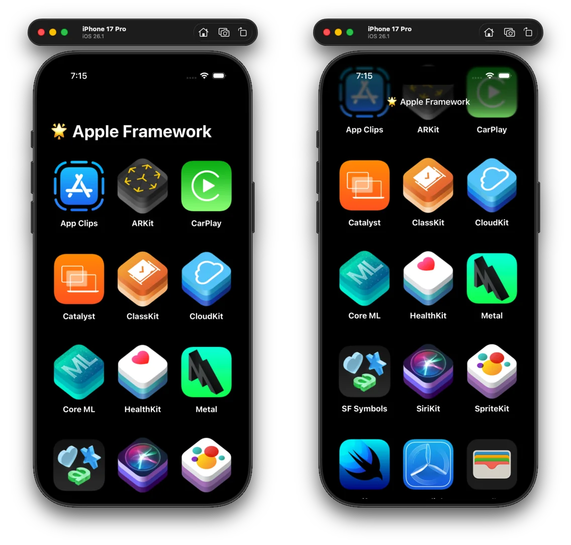 오늘은 UIKit의 UICollectionView를 이용해 애플 프레임워크 목록을 3열 그리드 형태로 보여주는 화면을 만들었다.