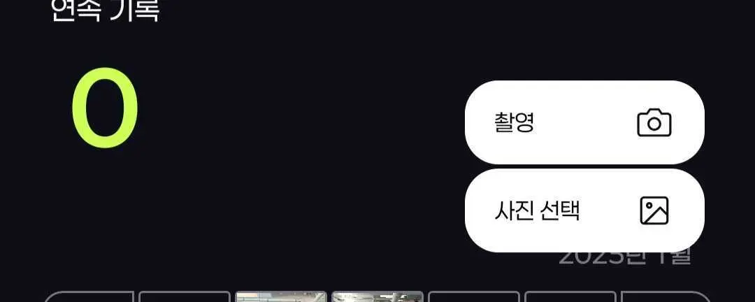 운동하기버튼을 누르면 인증 선택 버튼이 그 위에뜨며, 다른 영역을 선택시 인증 선택 버튼이 사라진다캘린더가 그려져 있고 인증한 날짜에는 날짜 대신 사진이 온다