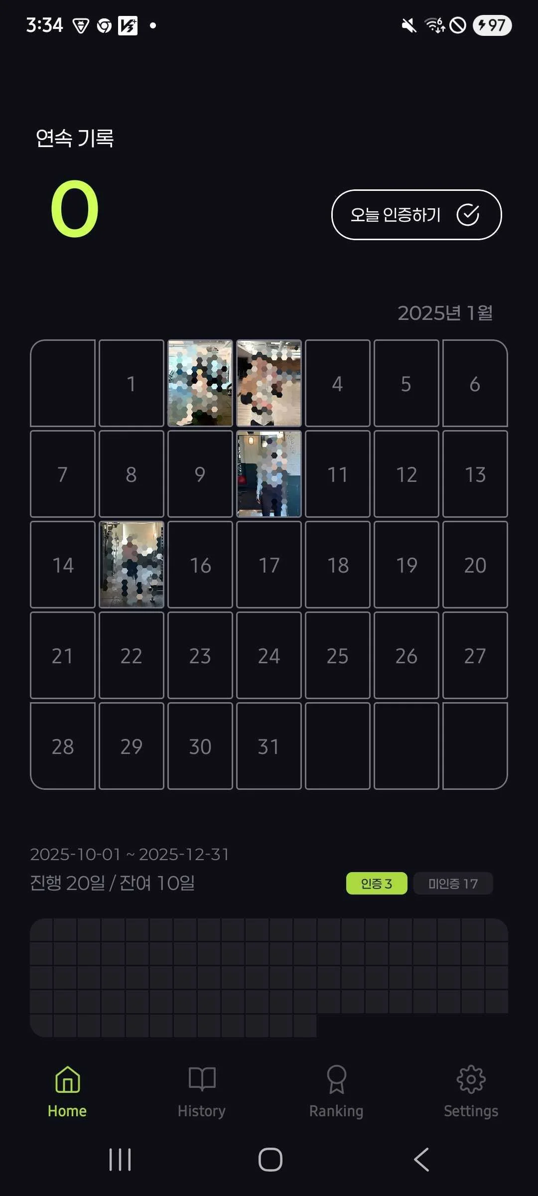 프로그레스박스에는 시즌에 맞는 날짜를 박스로 그리고 인증한 날만 색이 칠해진다 (깃헙 잔디 따라함)