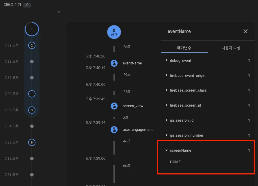 import analytics, {firebase} from '@react-native-firebase/analytics'; ... const eventTest = async () => { try{ firebase.app(); await analytics().logEvent('eventName', {screenName: 'HOME'}); //logEvent(이벤트이름, 전달할데이터); }catch(error){ console.log(error) } }테스트